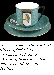 In addition to the decorative porcelains, the Burslem factory produced tablewares in both earthenware and bone china bodies. The Doulton tablewares combine good design, high quality, and contemporary, yet stylish and elegant, decoration. This is best illustrated in the art deco tablewares of the 1930s. Patterns such as ‘Tango’ , ‘Syren’, ‘Caprice’, Gaylee’ and many others are now regarded as classical examples of the Art Deco style as applied to tableware.