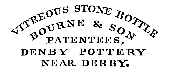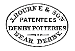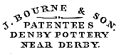 Marks are impressed, often deeply so, on the back or base of the wares and include some of the words ‘Bournes Potteries’, ‘J. Bourne & Son’ (from circa 1850), ‘Denby’, ‘Derbyshire’ and ‘England’.