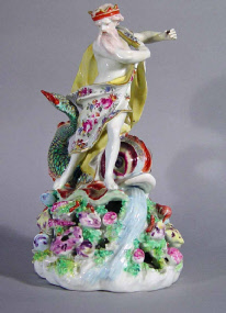 A beautifully modelled and enamelled figure of Neptune standing beside a large dolphin. Height 235 mm.