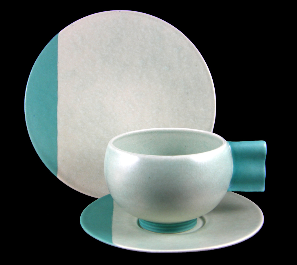 This Carlton Ware ‘Moderne’ trio in matt glaze finish is an example of the ‘Moderne’ or ‘Streamline’ style that evolved as part of Art Deco in the 1930s.