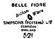 Simpson's most well known pattern is Belle Fiore, a bold freehand-painted underglaze design in nine colours. It was first advertised in 1940 and was still in production when tableware production ceased in 1976. Rights to the pattern were acquired by Wood & Sons Ltd and a 1977 advertisement in Tableware International illustrates Woods 'Belle Fiori' pattern.