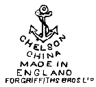 The trade name Royal Chelsea was used from c.1943 especially on teaware for the North American market. Marks do not include the company name, but have the script ‘Chelsea’, ‘New Chelsea’ or ‘Royal Chelsea’ trade name below an anchor.